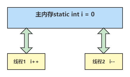 而 Java 的内存模型如下, 完成静态变量的自增, 自减需要在主存和线程内存中进行数据交换: