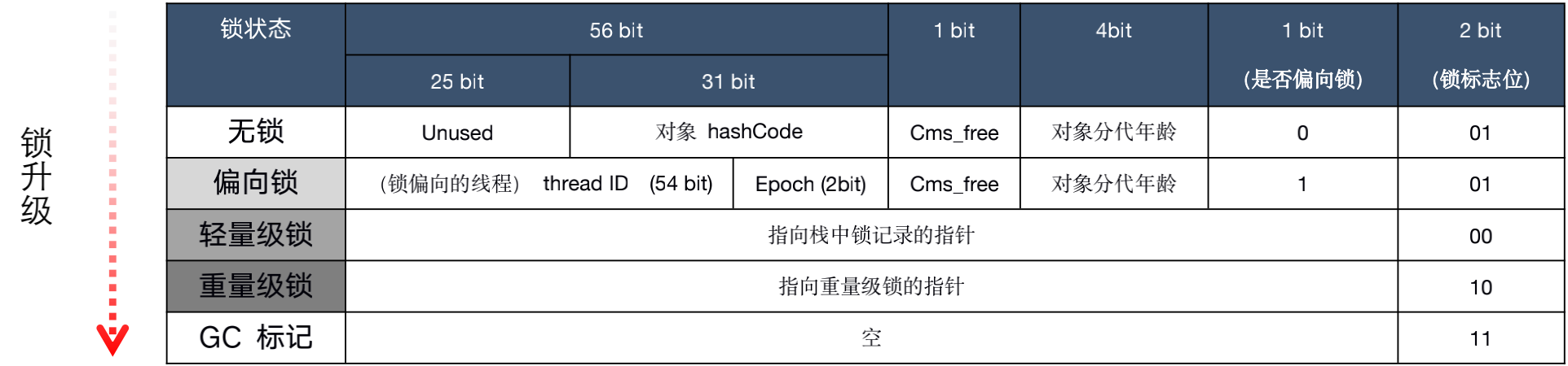 | 是自己的线程 ID. 锁是自己的. 无需做更多操作 | 101 (无锁可偏向) 线程 ID |